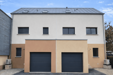 Maison contemporaine en mitoyenneté à étage en cœur de ville, avec garages intégrés et façade bi-ton en enduit