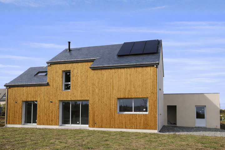 Construction d’une maison contemporaine avec bardage bois et panneaux solaires, à architecture moderne et extension en enduit