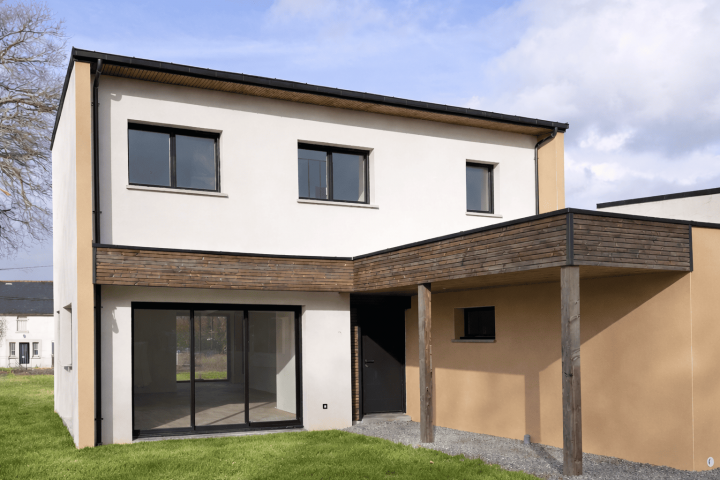 Cette maison contemporaine à étage est réalisée dans le cadre d’opérations groupées, garantissant une architecture harmonieuse et cohérente entre les habitations du lotissement. Son design moderne associe une façade en enduit clair à un bardage bois vertical qui apporte chaleur et caractère. Le carport positionné en façade avant est soutenu par une structure bois intégrée, offrant un espace de stationnement abrité tout en renforçant l’esthétique globale.