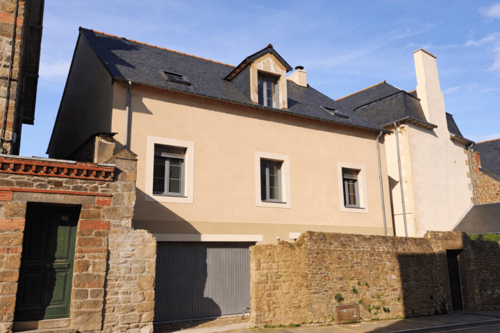 Projet de construction d’une maison de ville à Saint-Malo, sur trois niveaux, alliant enduit clair, toiture en ardoises et volumes traditionnels revisités