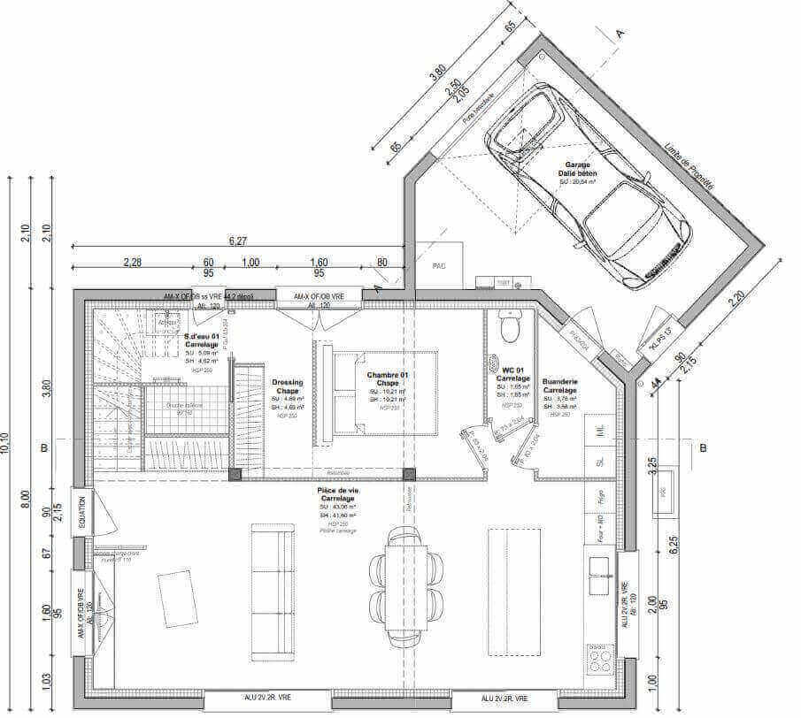 Au rez-de-chaussée le plan se compose d’une entrée, une pièce de vie de 41m² avec cuisine ouverte.