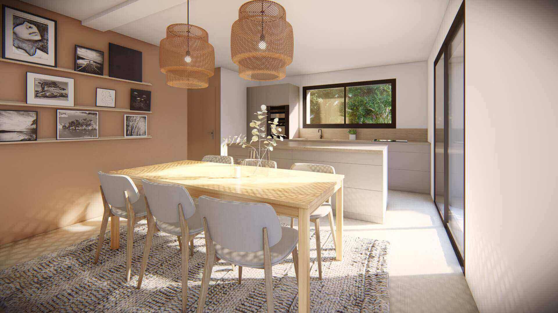 Au rez-de-chaussée le plan se compose d’une entrée, une pièce de vie de 41m² avec cuisine ouverte.