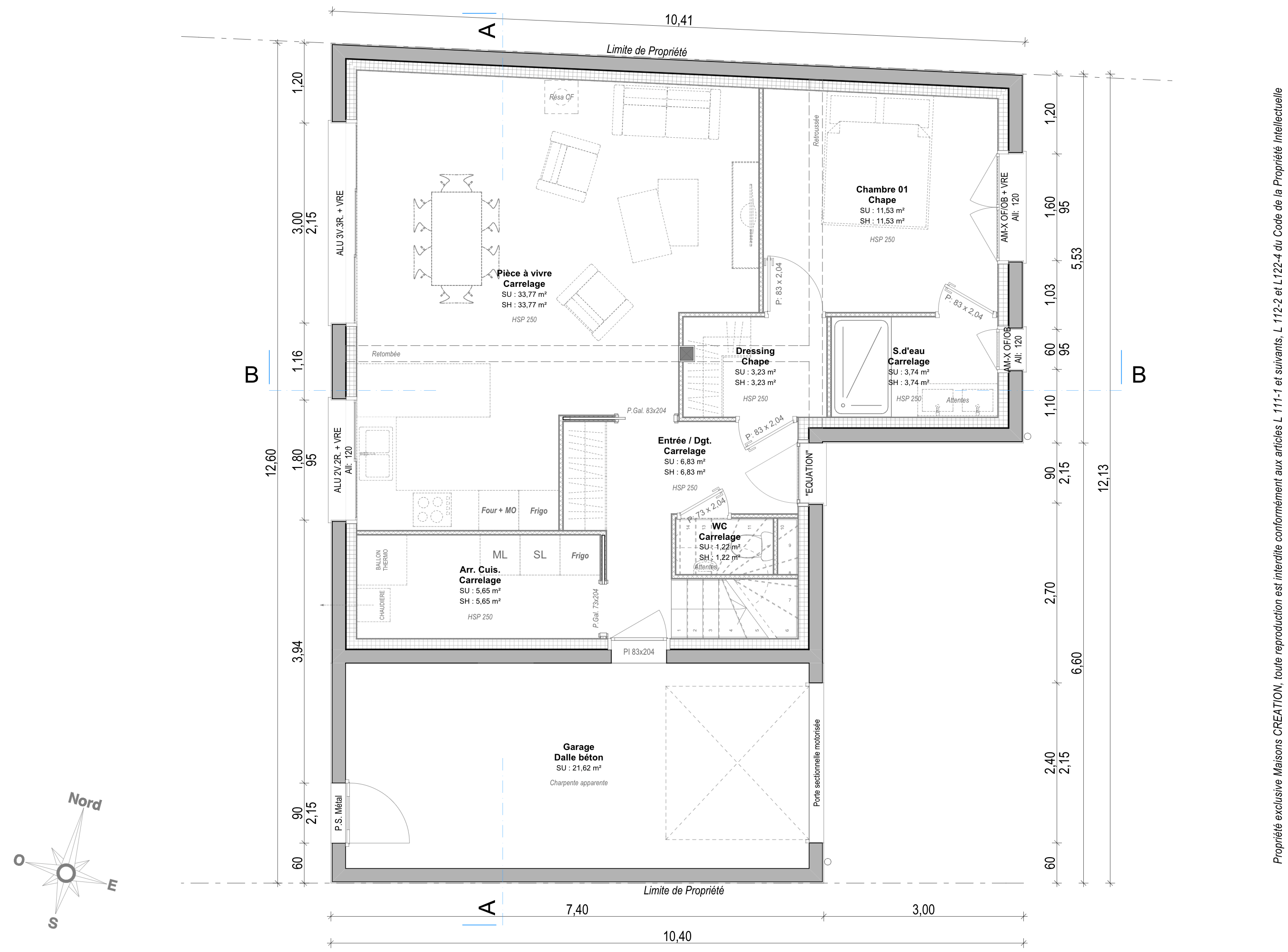 | Surface terrain : 404 m² | Surface annexe : 40 m² | Garage(s) : 1 |