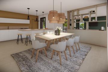 Au rez-de-chaussée le plan se compose d’une entrée, une grande pièce de vie de 46m² avec cuisine ouverte, une buanderie, WC indépendants, ainsi q'une suite parentale avec salle d'eau.