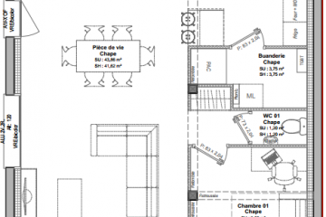- Au rez-de-chaussée : entrée, pièce de vie d'environ 40 m² avec cuisine ouverte, une buanderie et WC séparés.
