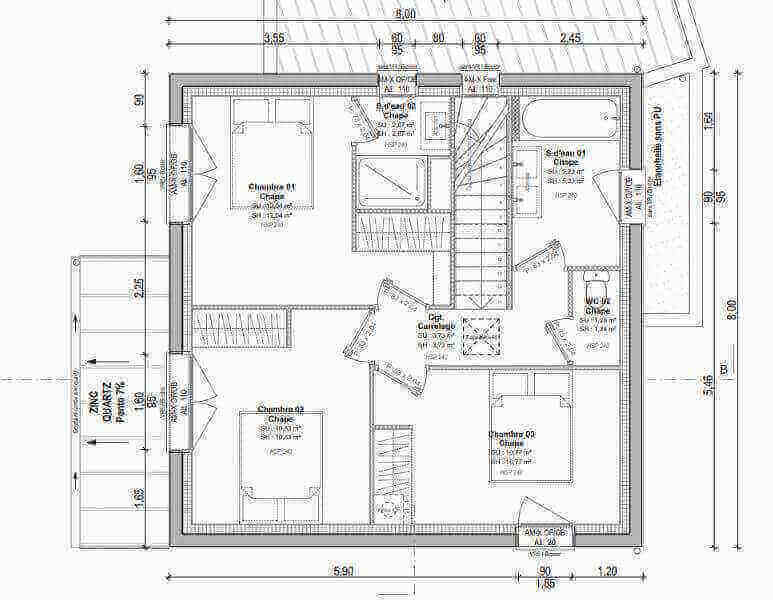 Cet exemple de maison de 100 m² habitables, répartie sur deux niveaux, se compose :