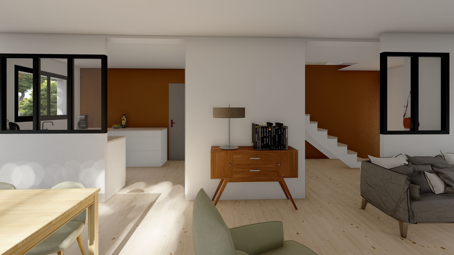 Cette maison comprend au rez-de-chaussée, une cuisine ouverte, un Salon / Séjour de 45m², des WC séparés,