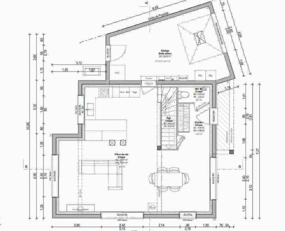 Le rez-de-chaussée se compose d'une entrée avec placard et un WC discret, d'un séjour/cuisine de 47 m² ouvert sur l'extérieur grâce aux baies vitrées qui laissent entrer la lumière. La cuisine donne accès à un garage de 22 m².
