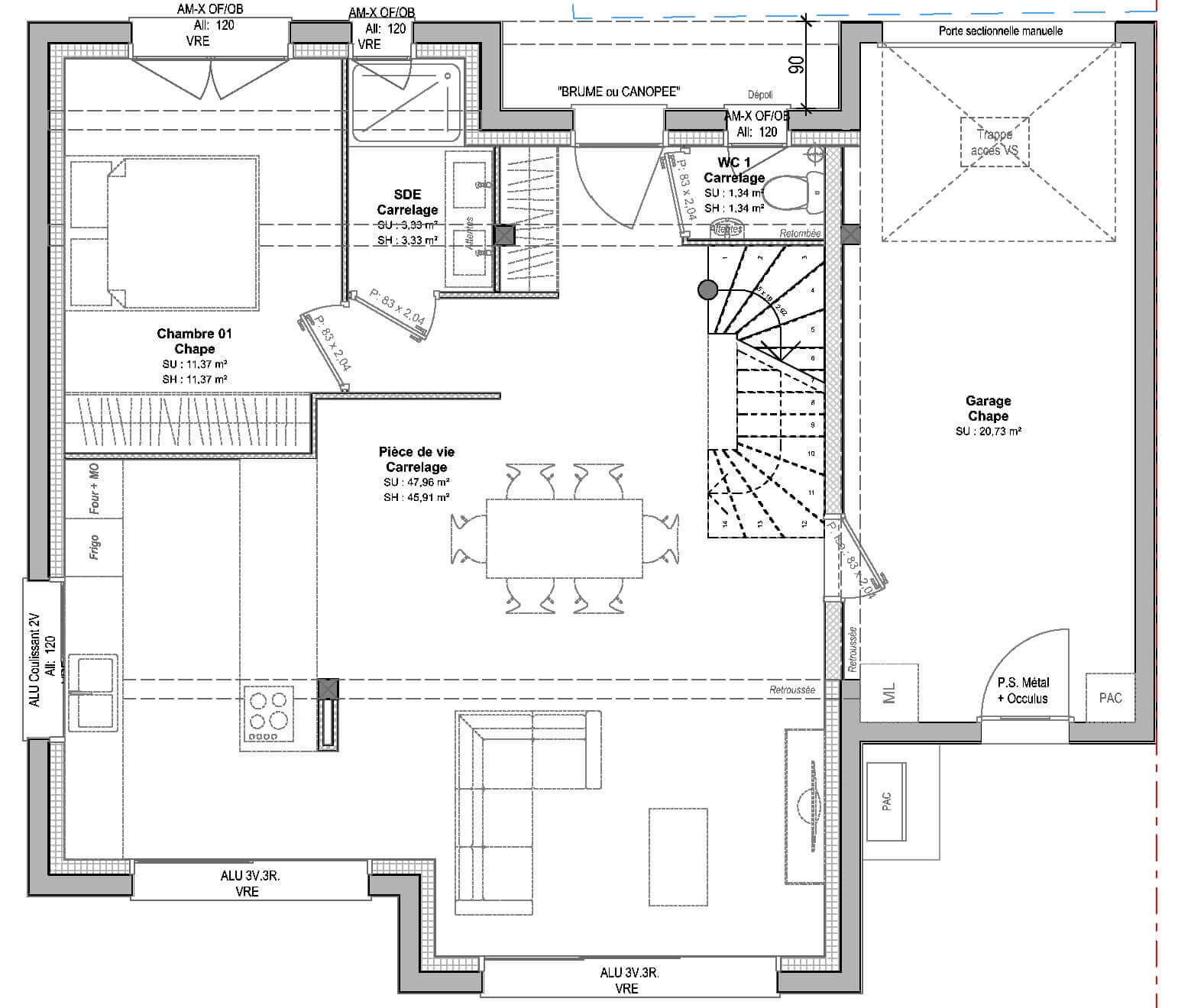 Cet exemple de maison contemporaine à étage, composée de 5 pièces et développant 102 m² habitables, se compose :