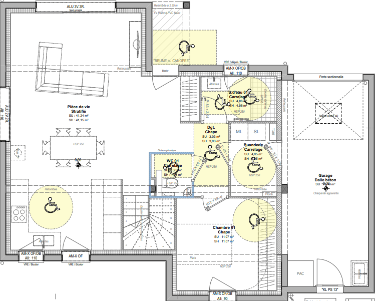 Cet exemple de maison développe 106 m² habitables et un grand garage de 21m² et se compose :