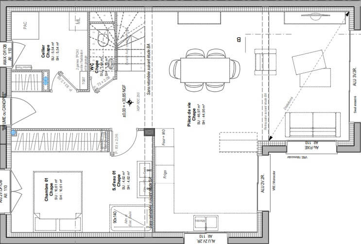 Cet exemple de maison RE2020 développe 119 m² habitables et se compose :
