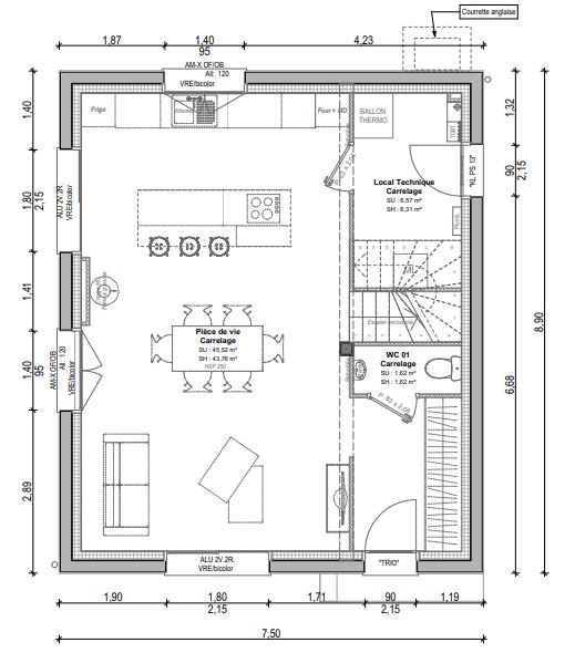 Au rez-de-chaussée, l'aménagement comprend une entrée avec placard, une spacieuse pièce de vie de 43 m² avec cuisine ouverte, un local technique de 6 m² et un WC séparé.