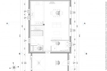 Cette maison comprend au rez-de-chaussée : une entrée, une cuisine ouverte sur séjour de 44 m², wc séparé et une buanderie.