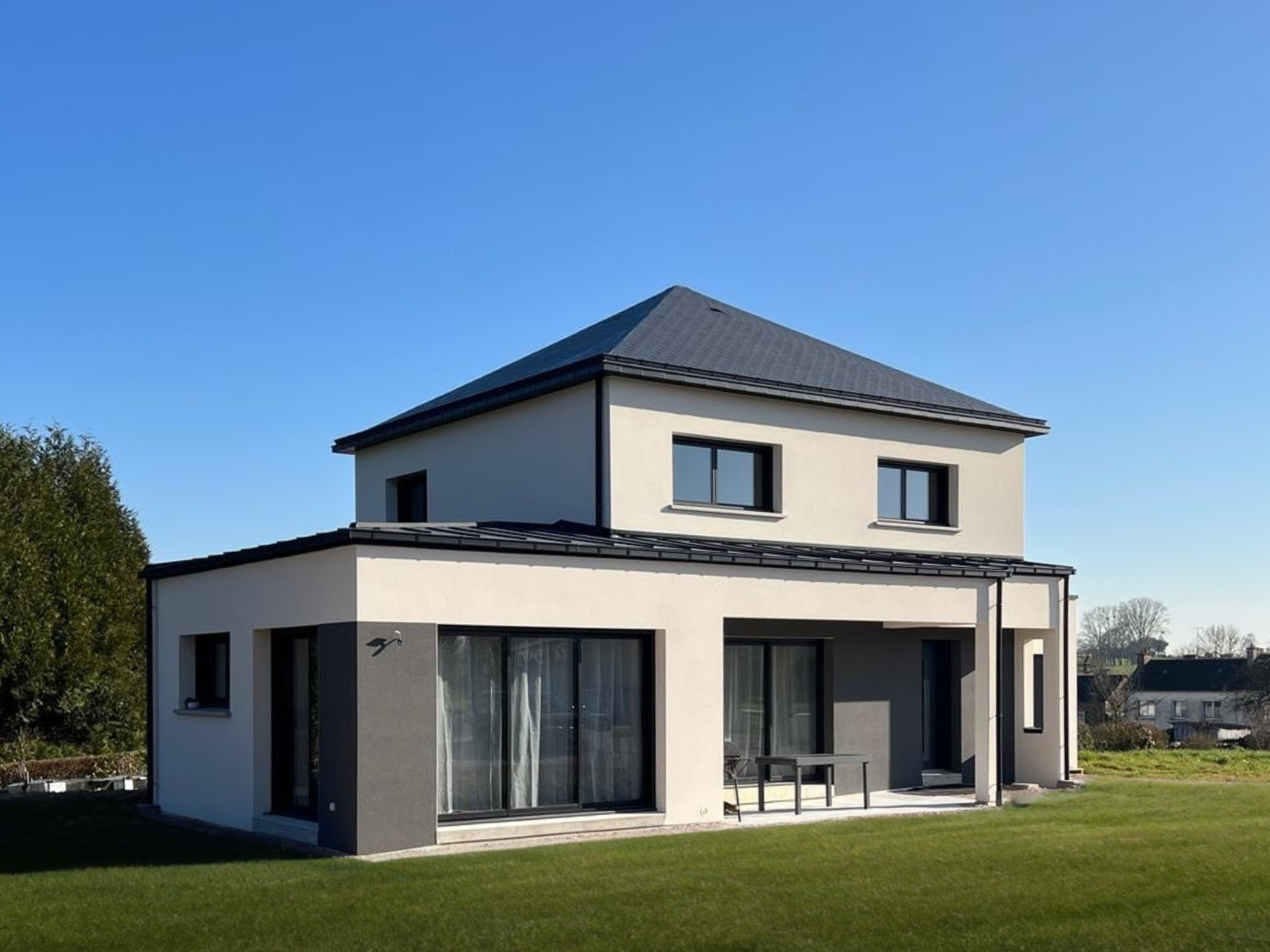 Cette maison contemporaine à étage, dotée d'une élégante toiture à 4 pans, d'un garage intégré et d'une terrasse couverte. Son architecture sobre et moderne, avec ses larges baies vitrées et ses façades en enduit blanc, offre confort et luminosité au quotidien.