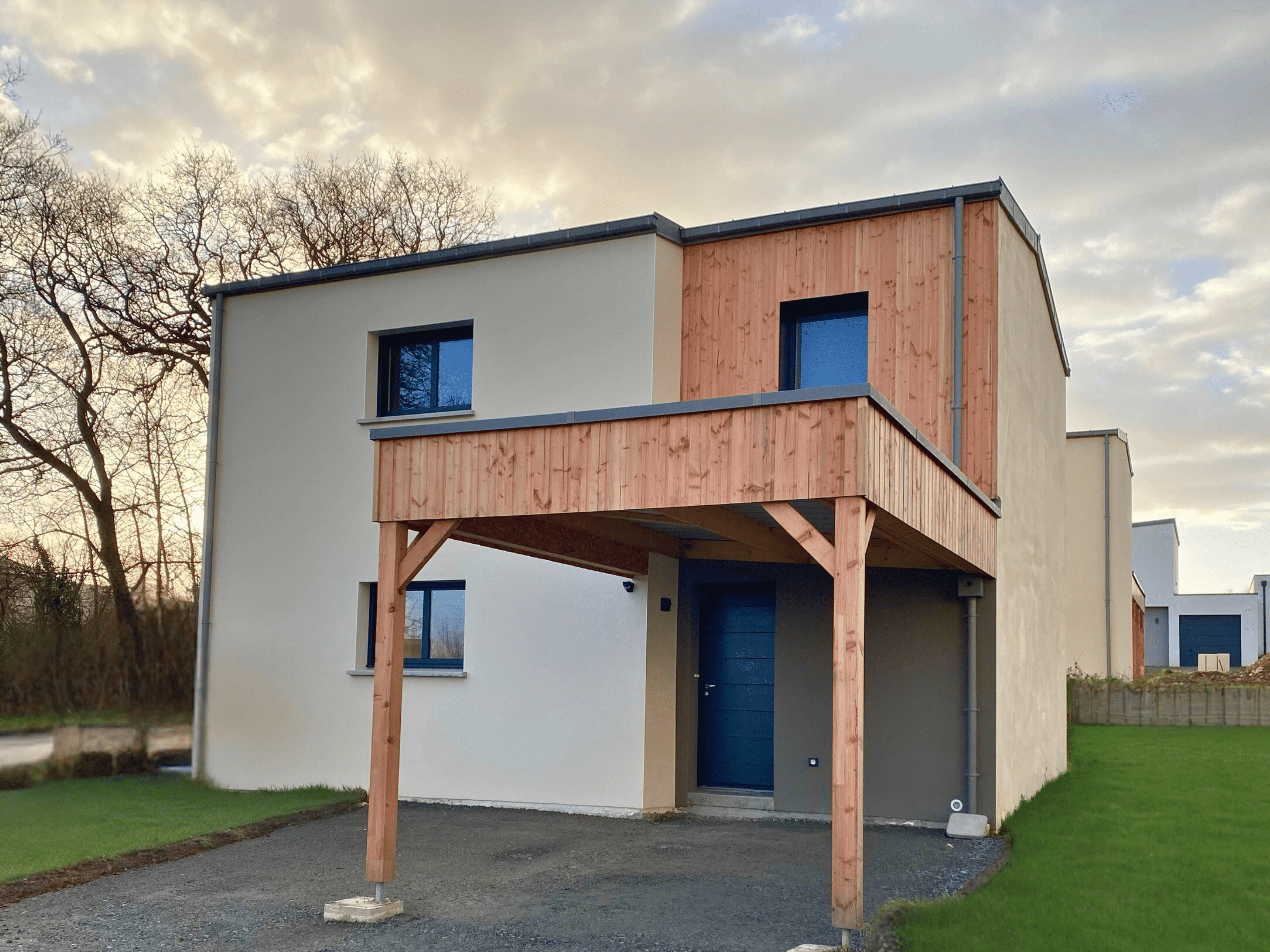 Cette maison contemporaine à étage est réalisée dans le cadre d’opérations groupées, garantissant une architecture harmonieuse et cohérente entre les habitations du lotissement. Son design moderne associe une façade en enduit clair à un bardage bois vertical qui apporte chaleur et caractère. Le carport positionné en façade avant est soutenu par une structure bois intégrée, offrant un espace de stationnement abrité tout en renforçant l’esthétique globale.