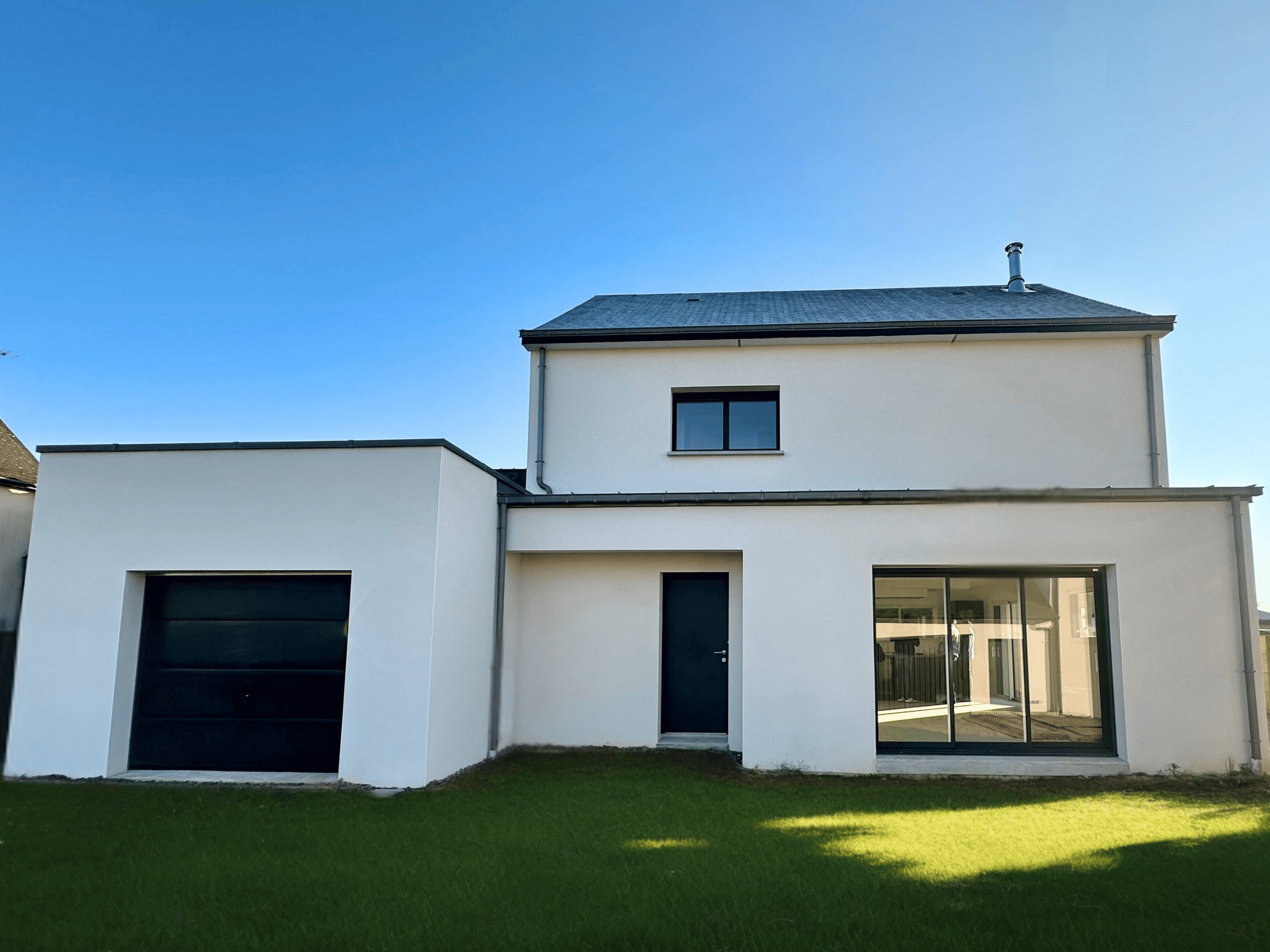 Maison moderne à étage avec toiture ardoises et zinc, façade épurée et garage intégré