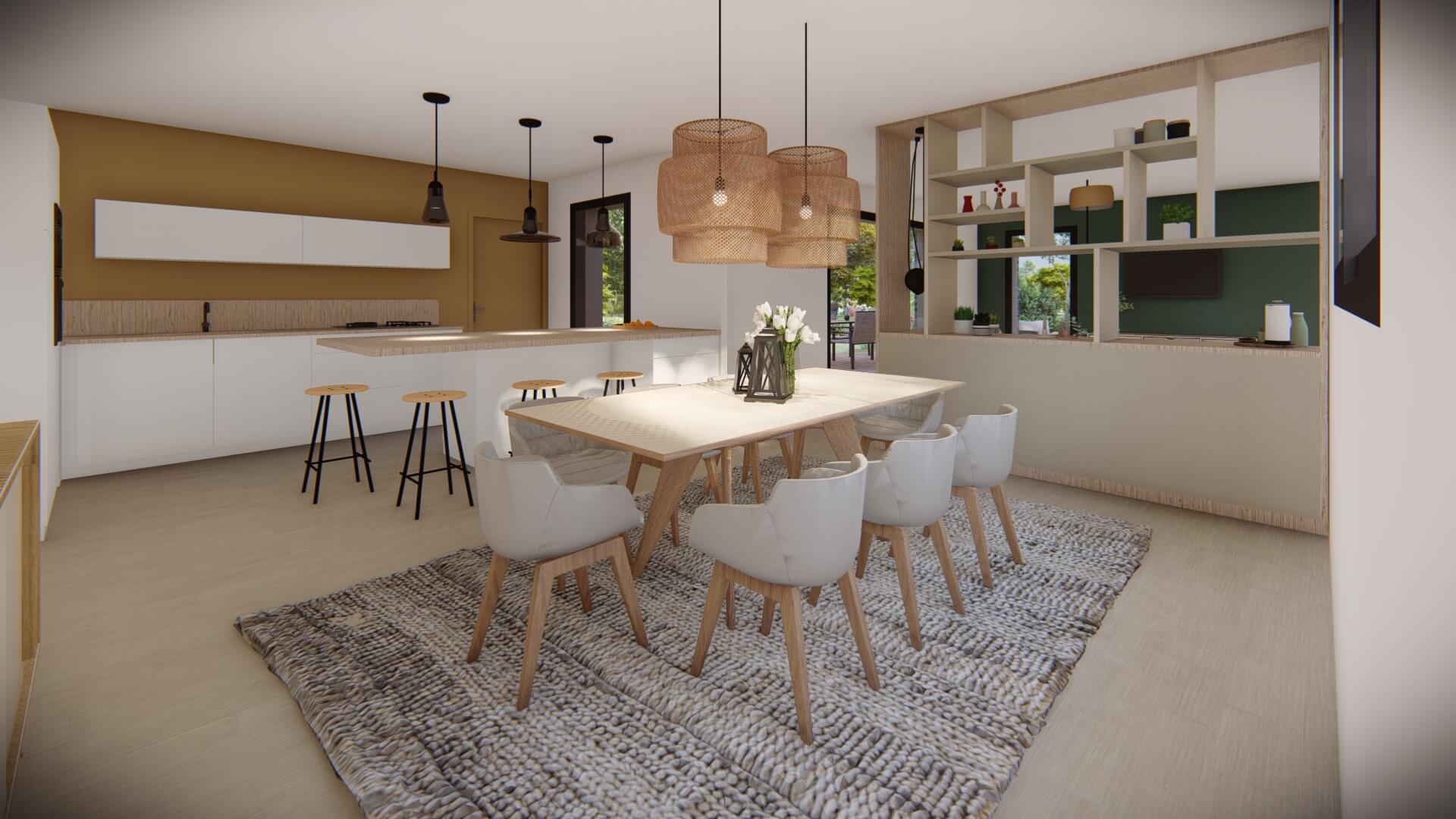 Au rez-de-chaussée le plan se compose d’une entrée, une grande pièce de vie de 46m² avec cuisine ouverte, une buanderie, WC indépendants, ainsi q'une suite parentale avec salle d'eau.