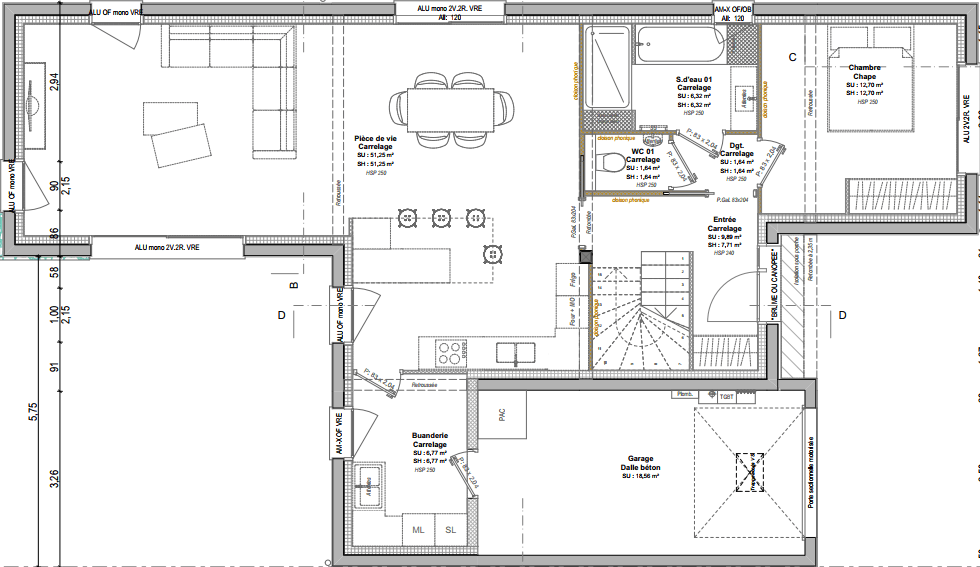 Au rez-de-chaussée le plan se compose d’une entrée, une grande pièce de vie de 46m² avec cuisine ouverte, une buanderie, WC indépendants, ainsi q'une suite parentale avec salle d'eau.