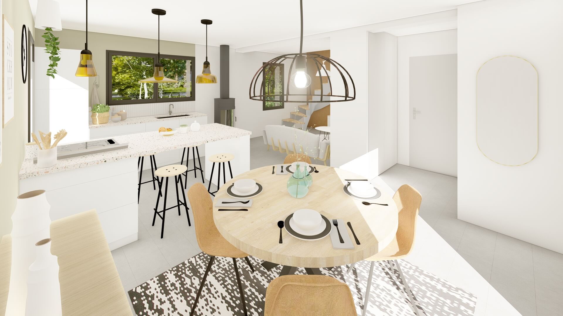 Au rez-de-chaussée le plan se compose d’une pièce de vie de 3m² avec cuisine ouverte, local technique et WC indépendants.