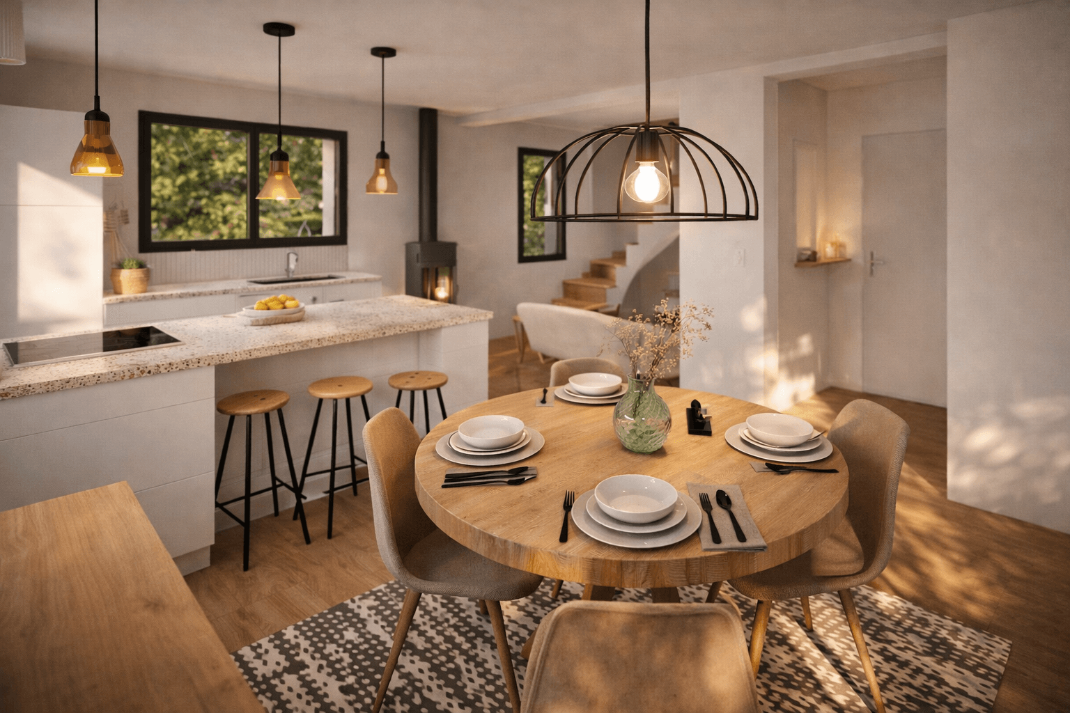 Au rez-de-chaussée le plan se compose d’une pièce de vie de 3m² avec cuisine ouverte, local technique et WC indépendants.