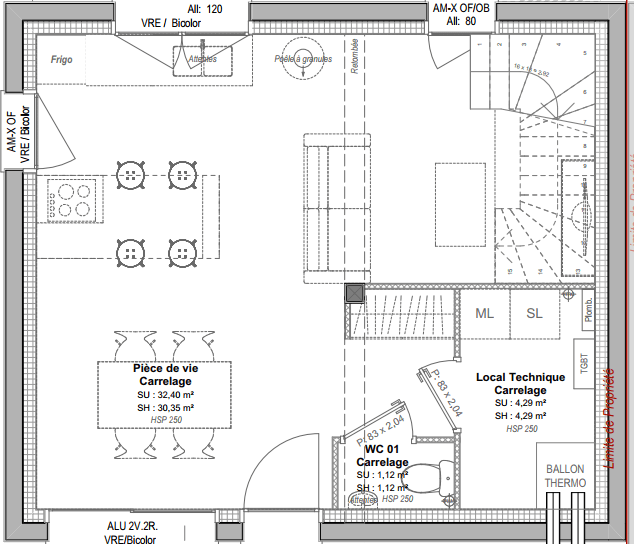 Au rez-de-chaussée le plan se compose d’une pièce de vie de 3m² avec cuisine ouverte, local technique et WC indépendants.