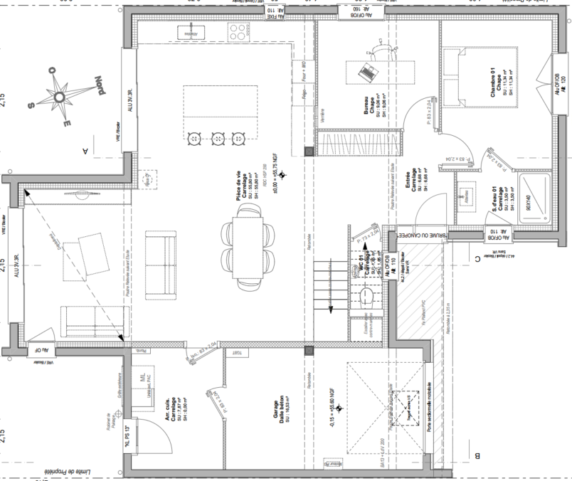 Cette maison comprend au rez-de-chaussée, une entrée, un Salon / Séjour de 56m² avec cuisine ouverte, une buanderie, des WC séparés et enfin d'une chambre parentale, avec une salle d'eau, avec dressing ou bureau,