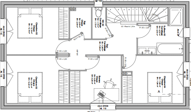 * à l'étage : 3 chambres, un bureau qui peut se transformer en 5ème chambre, des WC séparés, un placard de rangement et une salle de bains (avec baignoire et douche).