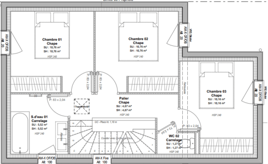 Maison de 3 à 4 chambres, entre 90 m² et 102m² habitables, comprenant :