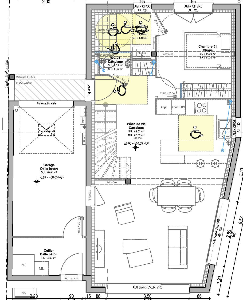 Comprenant au rez-de-chaussée, une entrée, une cuisine ouverte, un Salon / Séjour de 44 m², une chambre parentale, avec une salle d'eau, avec placard et de WC séparés,