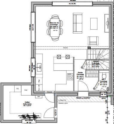 Au rez-de-chaussée, vous trouverez une entrée avec placard, une pièce de vie de 38 m² avec cuisine ouverte donnant accès à une terrasse, un cellier / arrière-cuisine de 12 m² et WC séparés.
