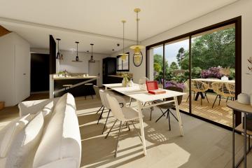 Au rez-de-chaussée, vous trouverez une entrée avec placard, une pièce de vie de 38 m² avec cuisine ouverte donnant accès à une terrasse, un cellier / arrière-cuisine de 12 m² et WC séparés.