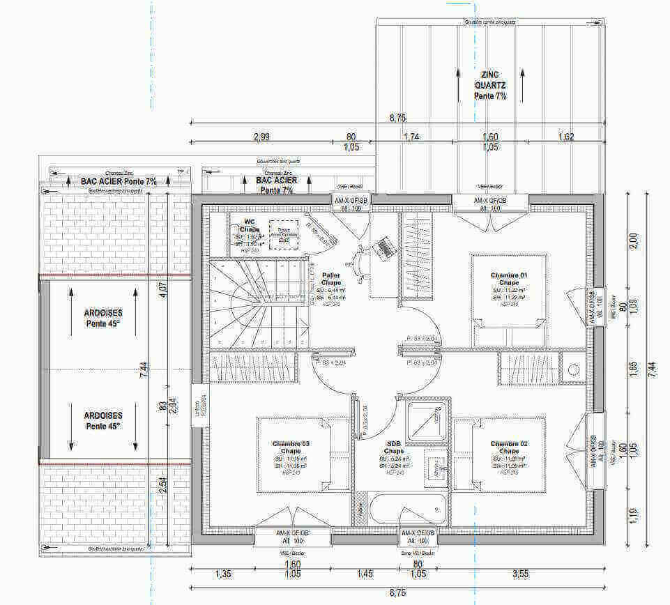 Au 1er étage, on trouve 3 chambres de 11 m² avec placard, une salle d'eau/bain, un espace bureau et un WC séparé.
