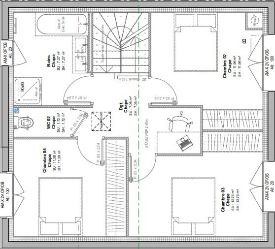 Cet exemple de maison RE2020 développe 119 m² habitables et se compose :